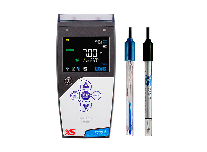 Soporte de campo con 3 orificios para electrodos, soluciones tampón coloreadas, cable USB, fuente de alimentación, instrucciones de uso y maletín de transporte.